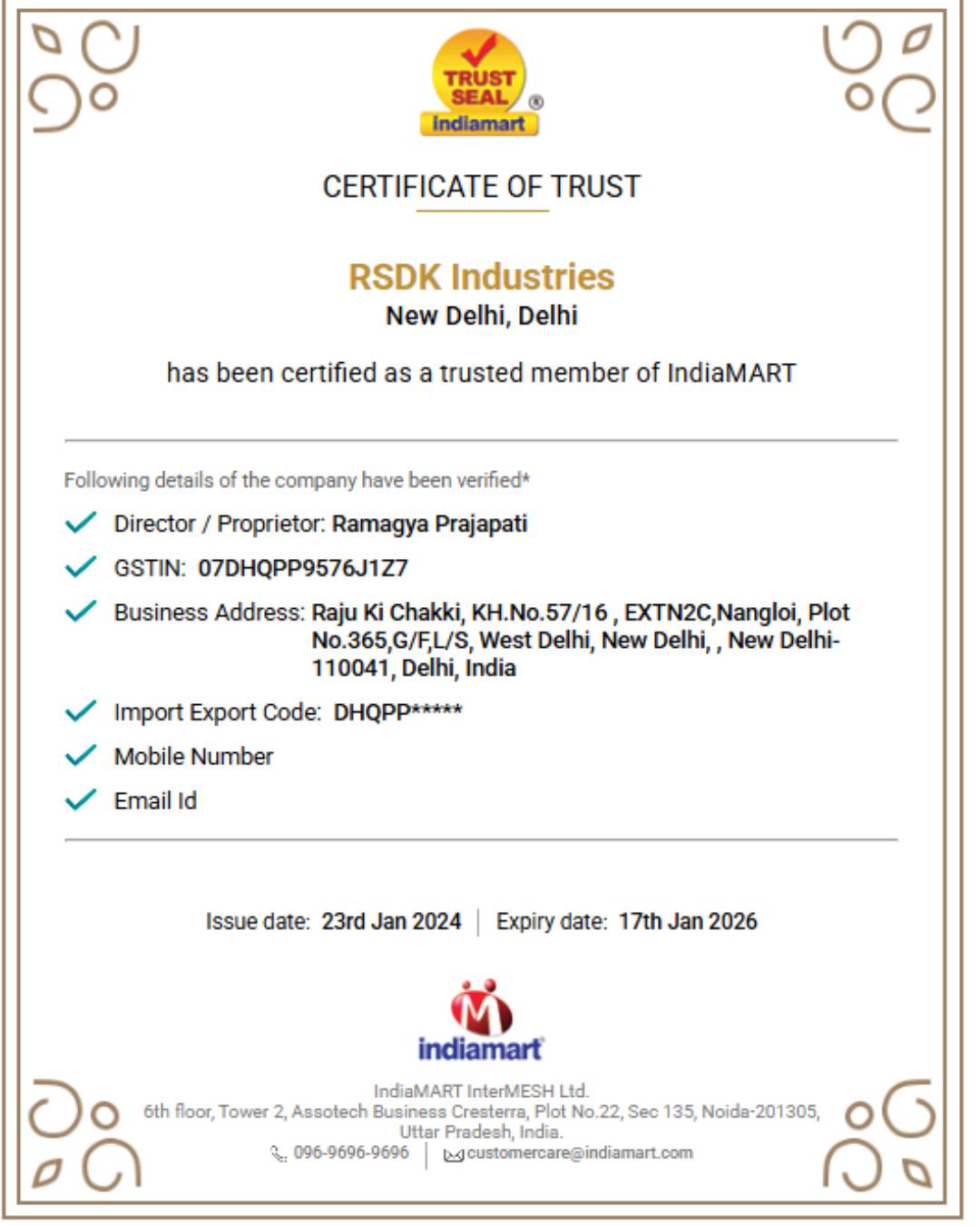 RSDK Industries is a professionally registered entity specializing in manufacturing, exports, engineering solutions, recognized for its commitment to quality and reliability. Here’s a concise yet professional description of RSDK Industries incorporating its TrustSEAL verification and ISO 9001:2015 certification: