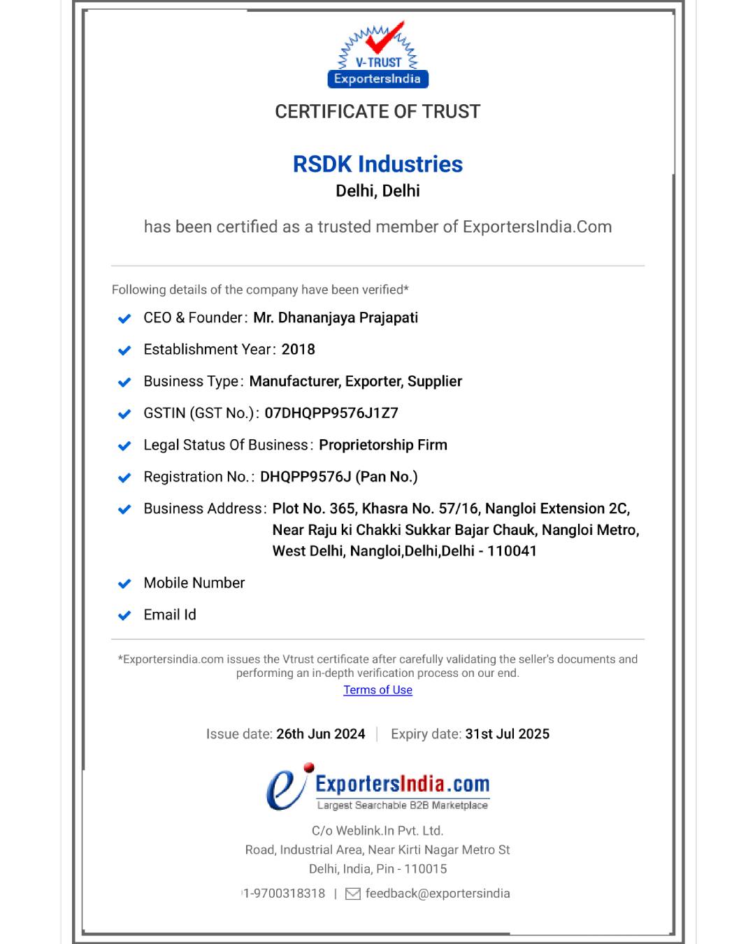 RSDK Industries is a professionally registered entity specializing in manufacturing, exports, engineering solutions, recognized for its commitment to quality and reliability. Here’s a concise yet professional description of RSDK Industries incorporating its VTrust verification and ISO 9001:2015 certification: